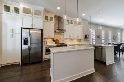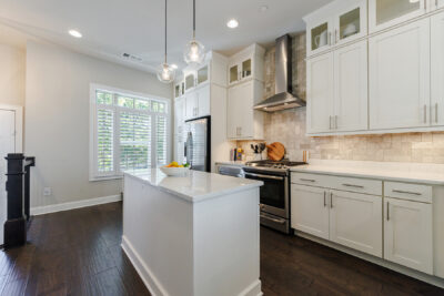 As you step inside, you’ll be greeted by abundant natural light flooding the open floorplan, highlighted by gorgeous hardwood floors throughout. The stunning kitchen boasts ceiling-height white cabinets, a beautiful stone island, a breakfast bar, and stainless-steel appliances, including a four-burner gas stove. The eat-in kitchen area and dining space offer plenty of room for entertainment.