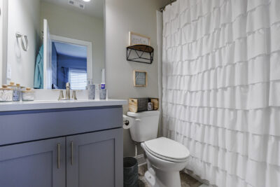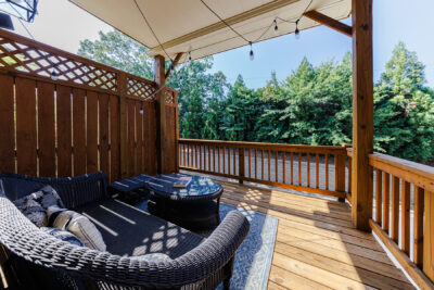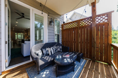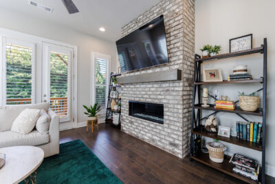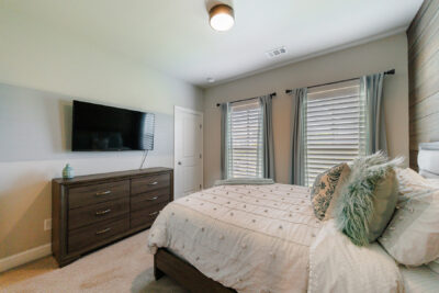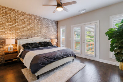Upstairs, the oversized owner’s suite is a private oasis featuring an additional deck perfect for morning coffee, an accent wall of brick, a modern fan, a spa-like bathroom with stone floors, a large walk-in shower with double heads, and a double-sink vanity. The custom walk-in closet offers ample storage space. The secondary bedroom also features an ensuite bathroom, a custom walk-in closet, and a wood accent wall, creating a cozy and inviting space. The laundry area is conveniently located between both bedrooms.