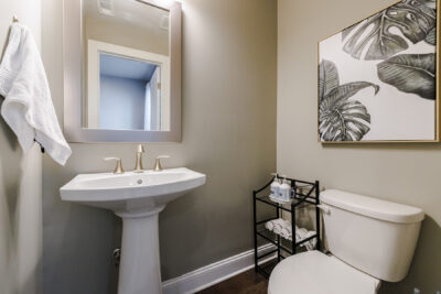 The lower level offers a versatile flex space for an office, workout room, or playroom. This area features beautiful brick accent walls, plenty of natural daylight, and a half bathroom. Access to the one-car garage is also available from this level.